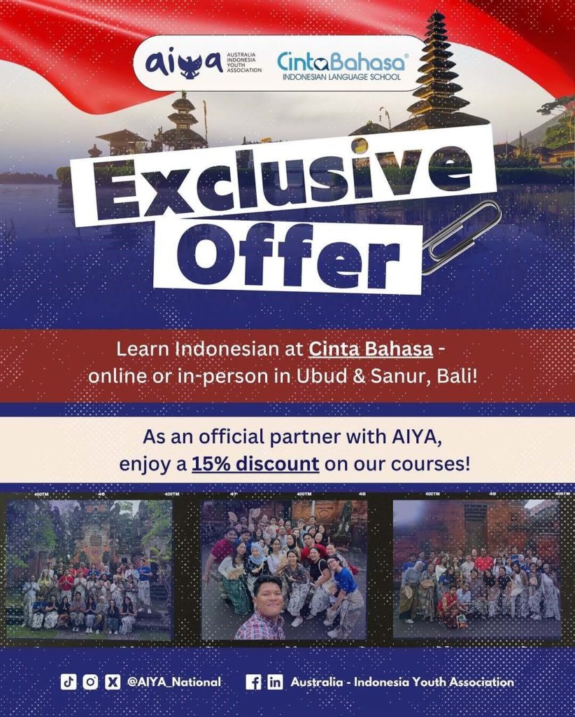 All AIYA members can now enjoy 15% off Cinta Bahasa’s online or in-person Indonesian language classes! To register, simply log in to your AIYA membership dashboard > Resource Center > Cinta Bahasa.
